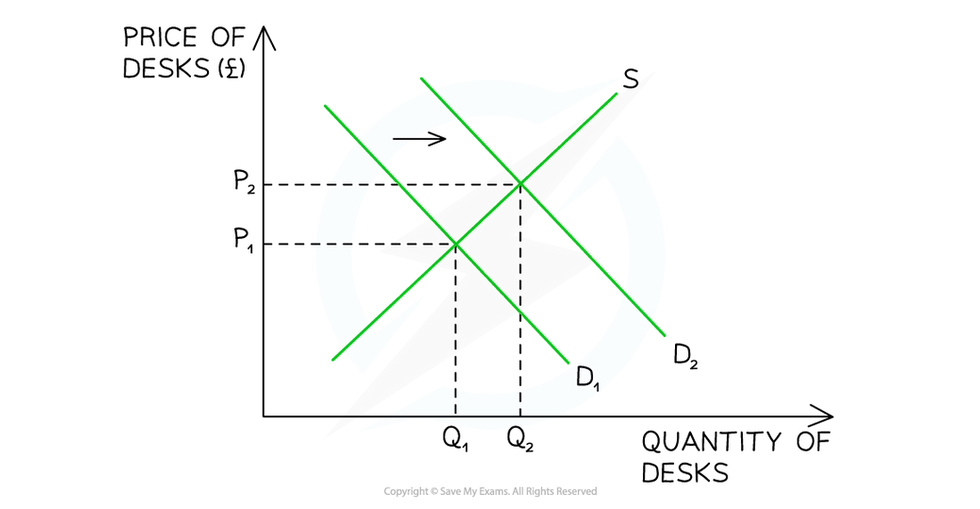 Diagram showing an increase in demand for desks due to a temporary change in tastes/fashions
