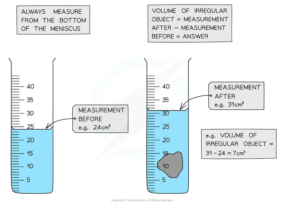 By measuring the change in volume, a measuring cylinder can also be used to find the volume of an irregular shape