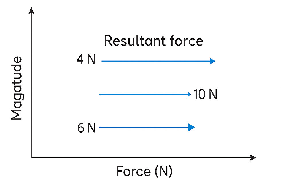 Example:If 10 N pushes right and 4 N pushes left,Resultant Force = 10 N – 4 N = 6 N to the right
